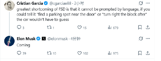一位网友评论称:“FSD更大的缺点在于它无法通过语音来触发操作 。如果你能告诉它“在门口附近找个停车位 ”或者“过一个街区后右转”,汽车就不用猜测了。”