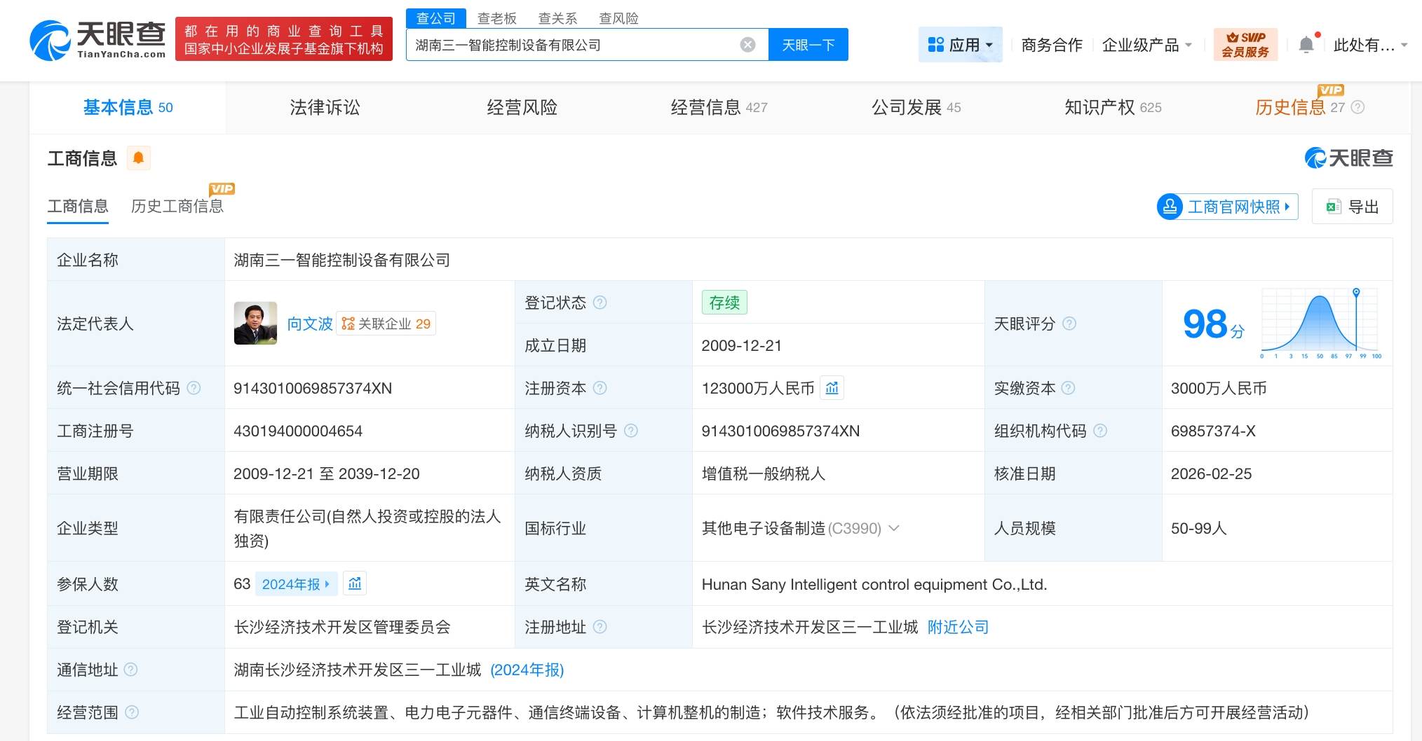 该公司成立于2009年12月,法定代表人为向文波,经营范围为工业自动控制系统装置 、电力电子元器件、通信终端设备、计算机整机的制造,软件技术服务 ,由三一重工(600031)全资持股。
