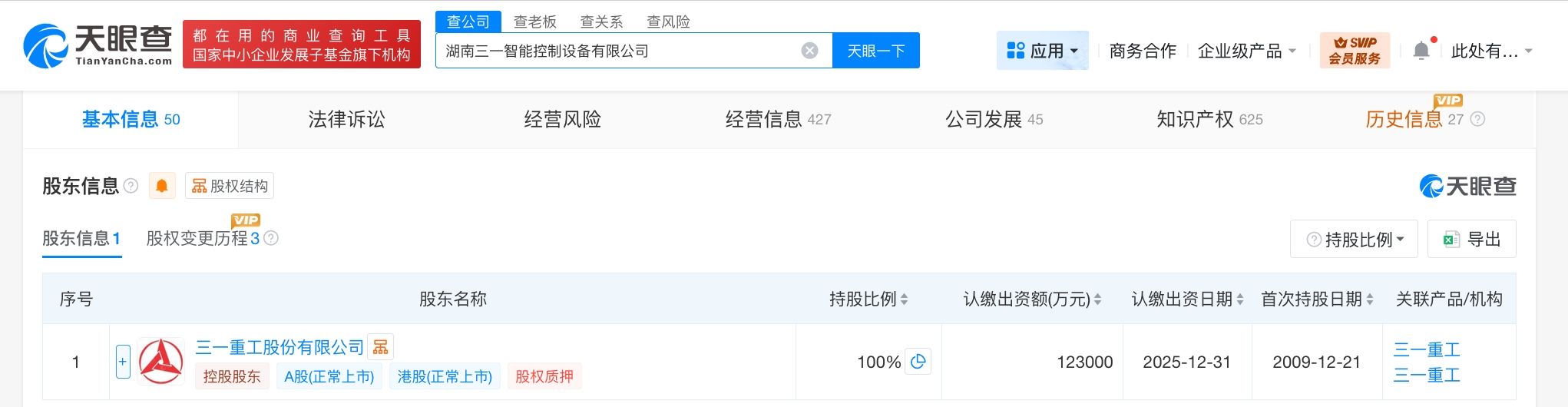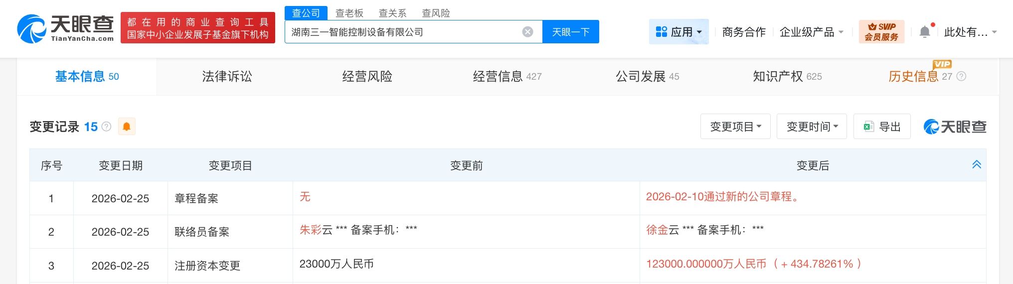 天眼查App显示 ,近日,湖南三一智能控制设备有限公司发生工商变更,注册资本由2.3亿人民币增至12.3亿人民币 ,增幅约435% 。